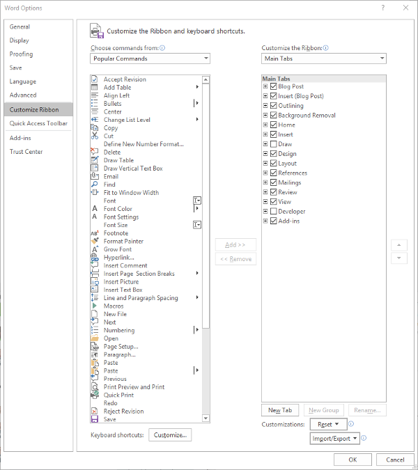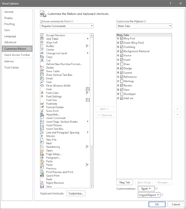 Just as we did with the Quick Access Toolbar above, you can adjust what is displayed in the Ribbon. Since we’ve established that - in this example - we have no purpose for either the Mailings or Draw tabs, we can uncheck them to remove them from the Ribbon display.