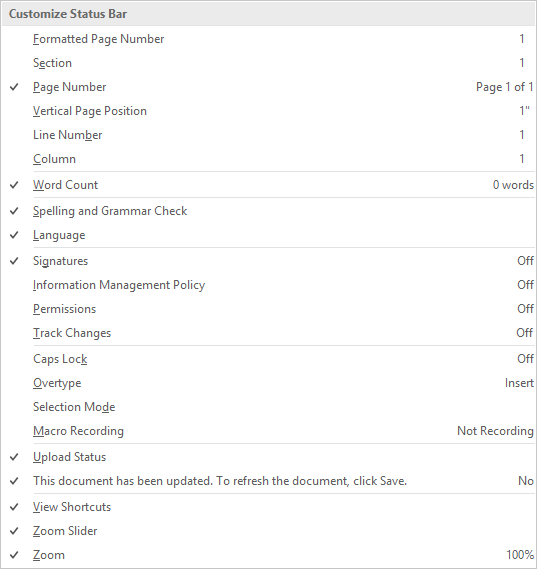 At the very bottom of the window is the Status Bar, which can be altered to provide other valuable information based on what you have prioritized. Doing so is very simple: just right-click on the Status Bar, and select (or deselect) the options.